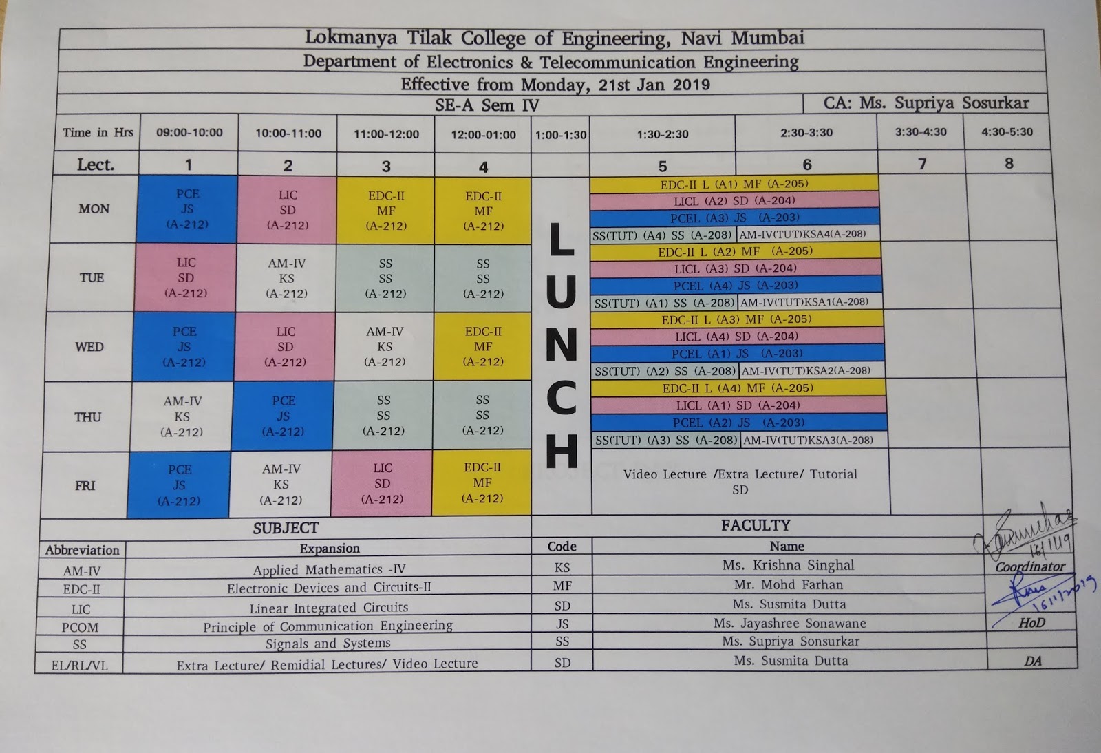 Time Table of Even Semester AY 2018-19 effective from 21-Jan-2019